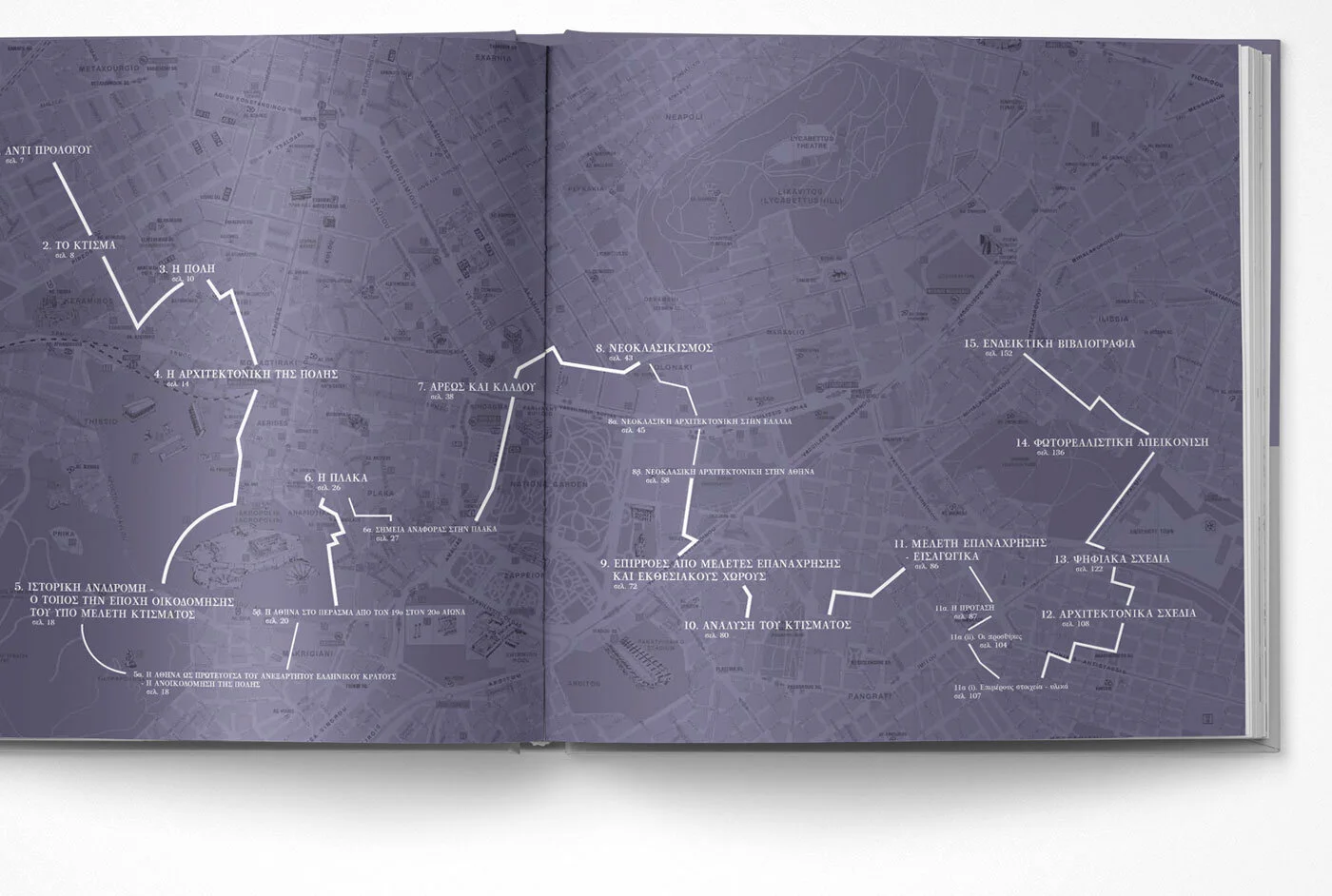 The Index spread uses a map of the Plaka district in Athens, where the contents and page numbers are represented as a route.